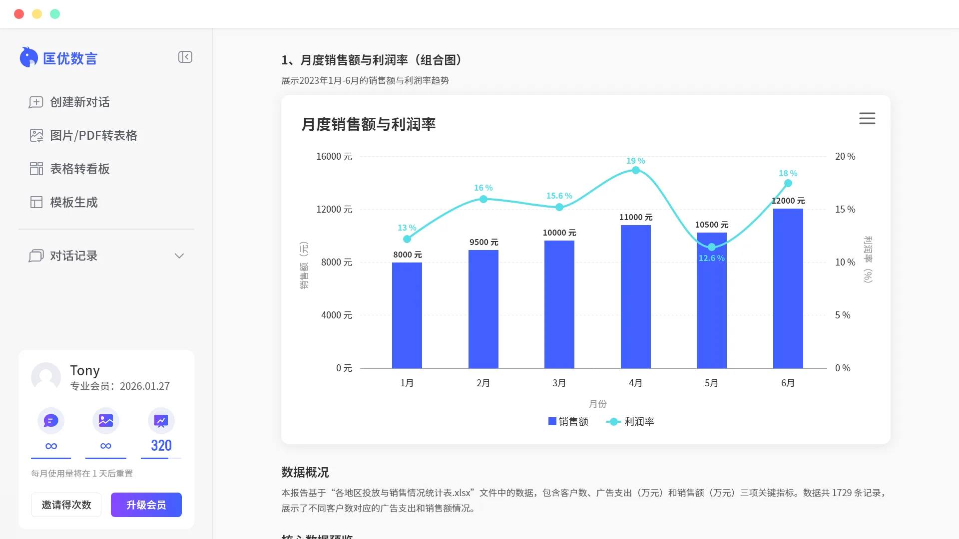 匡优数言将杂乱的电子表格转化为图表、摘要和可直接汇报的分析。